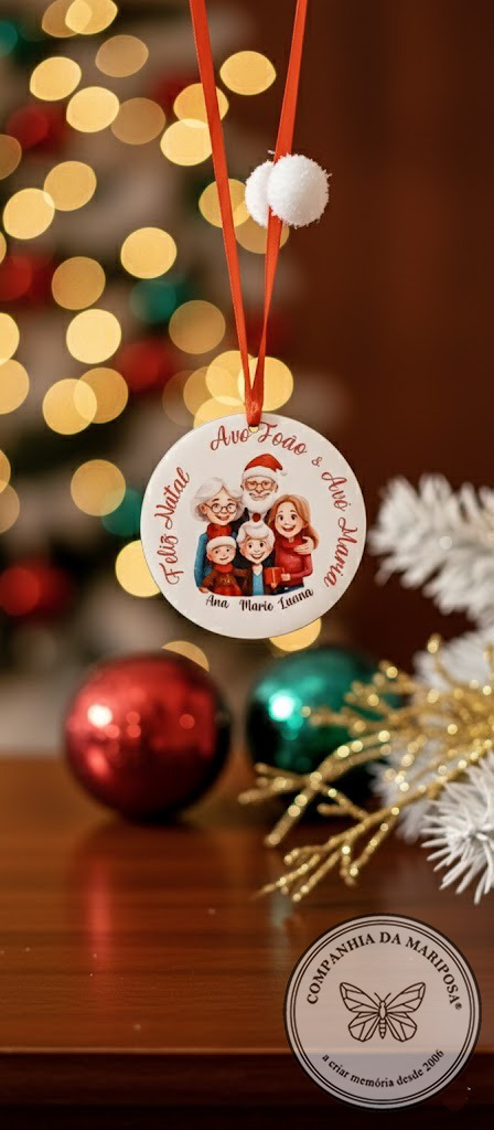 Crie uma lembrança inesquecível do Natal com este enfeite redondo e totalmente personalizado. É o presente perfeito para celebrar a união familiar, homenagear os avós ou guardar a memória de um momento especial, tornando a sua árvore única.
