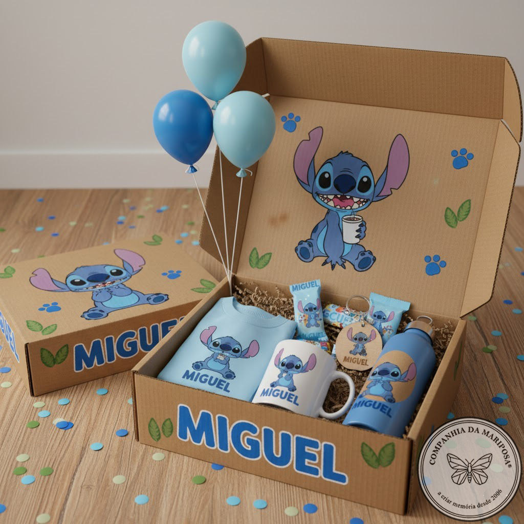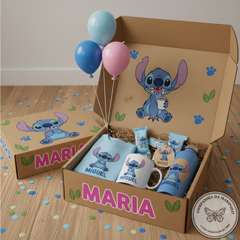 Para os fãs da criatura mais adorável da Disney, este Kit Stitch Personalizado é a escolha ideal para aniversários, Natal ou regressos às aulas. A caixa é totalmente personalizada com o nome e o tema do Stitch (azul/rosa e branco).