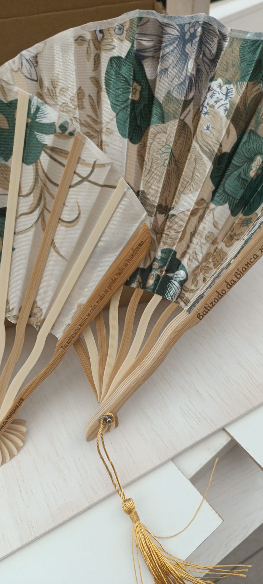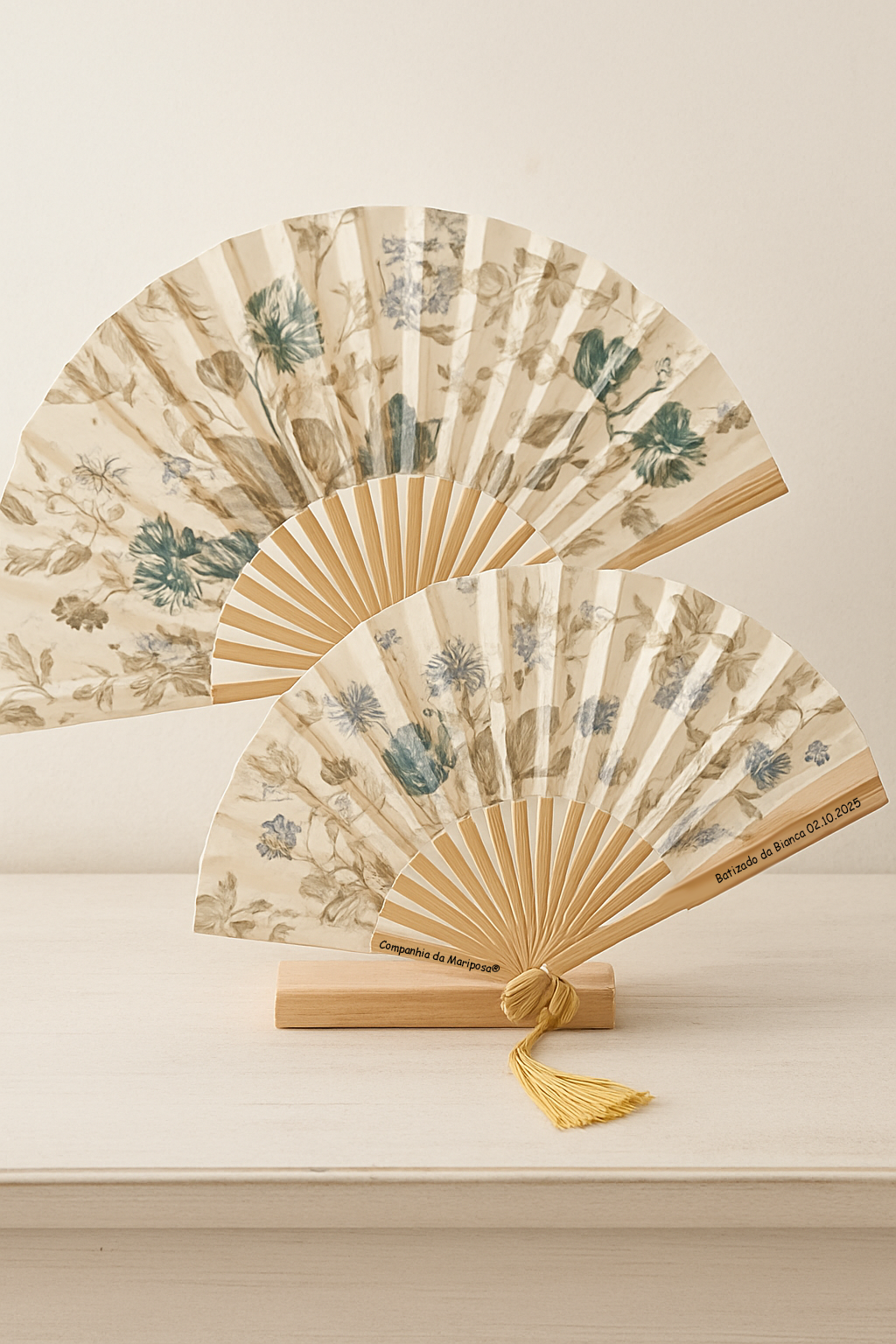 Leques artesanais com estampas florais suaves, perfeitos para proporcionar frescura com charme.