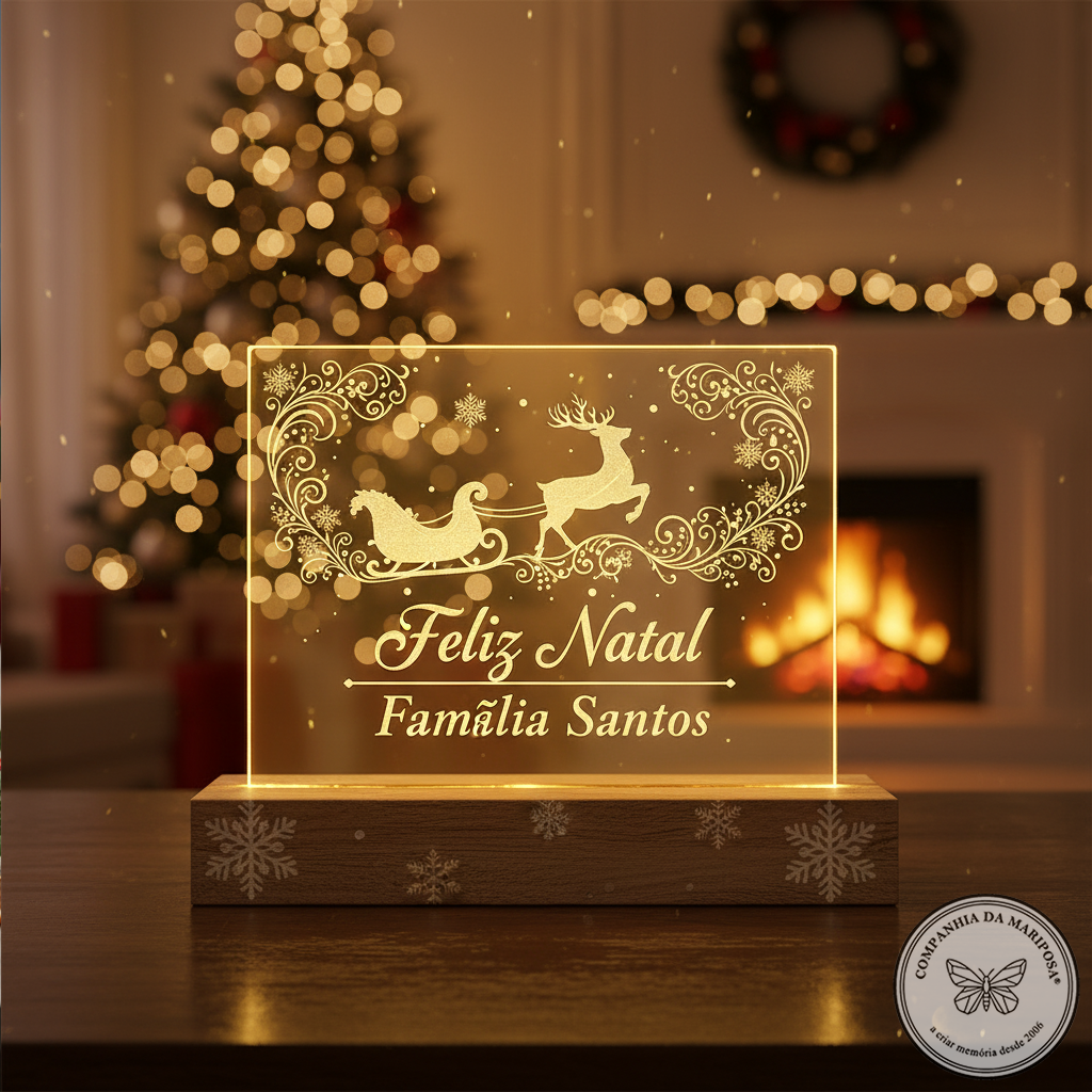 Material: Placa de acrílico transparente gravada com o design “Feliz Natal” e renas/trenó.