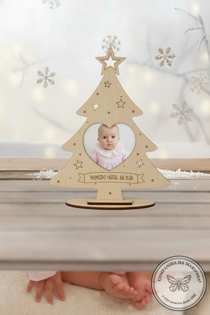 Personalização Central: A base da árvore inclui uma fita para gravação do nome do bebé, complementando a mensagem “PRIMEIRO NATAL DA [Nome do Bebé, Ex: FLOR]”.